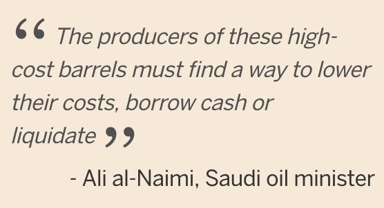 高コストの生産者とは、アメリカのシェール、カナダのオイルサンド、それに海底油田などで、原油価格が1バレル100ドル以上だった時に採算が取れたが、今は 30ドル近辺だ。 2014年6月以降、70%以上下落した原油価格では生き残れない業界にとってこの発言は、生死を決める警告だ(a shot across the bow)。