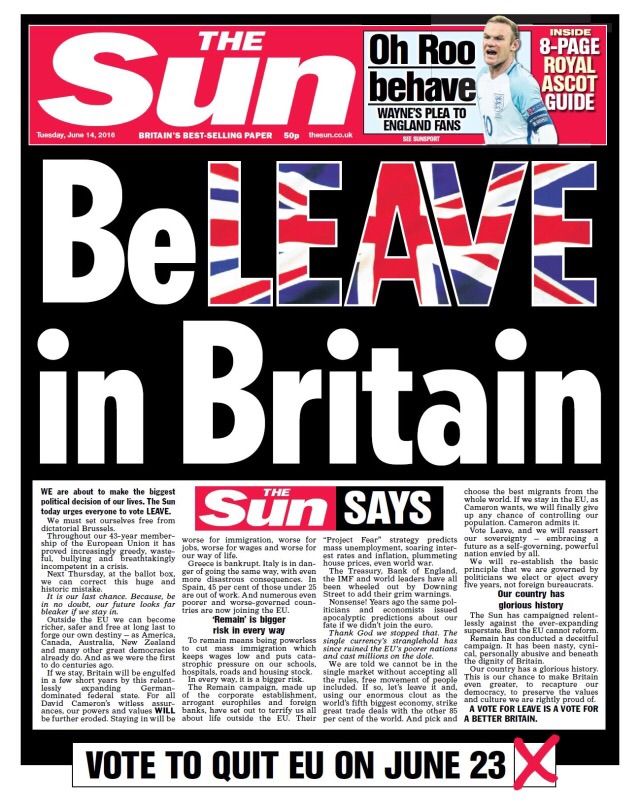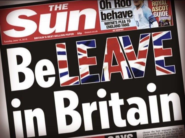 The Sun の社説は We urge our readers to beLEAVE in Britain and vote to quite the EU on June 23 (読者の皆さんにはイギリスを信じて、 6 月23 日に EU離脱を投票するよう促す)。信じるのbelieveと離脱の leaveを引っかけています。