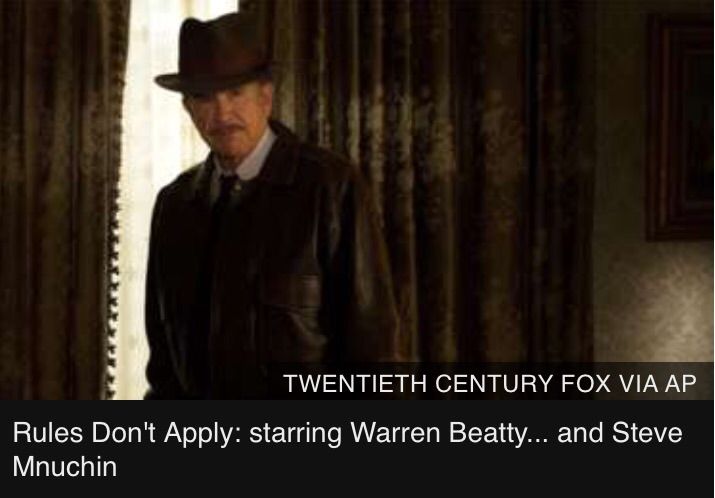 これから公開される映画Rules Don’t Applyで、バンカー役を演じている。ムニューチン氏はハリウッドでも長く仕事をしていて、