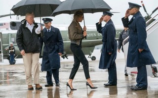 トランプ夫人は、ホワイトハウスからヘリコプターのマリン・ワンで被災地に向かう際に、雨降る中、ピンヒールのくつ、黒いクロップドパンツ(足首が見える細身のパンツ)、アーミーグリーンのボンバージャケットを身につけ、髪の毛をきれいにブローして、居並ぶカメラマンの前に現れたということです。