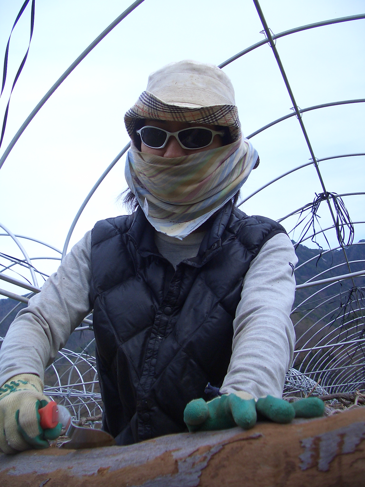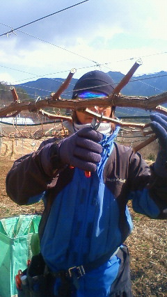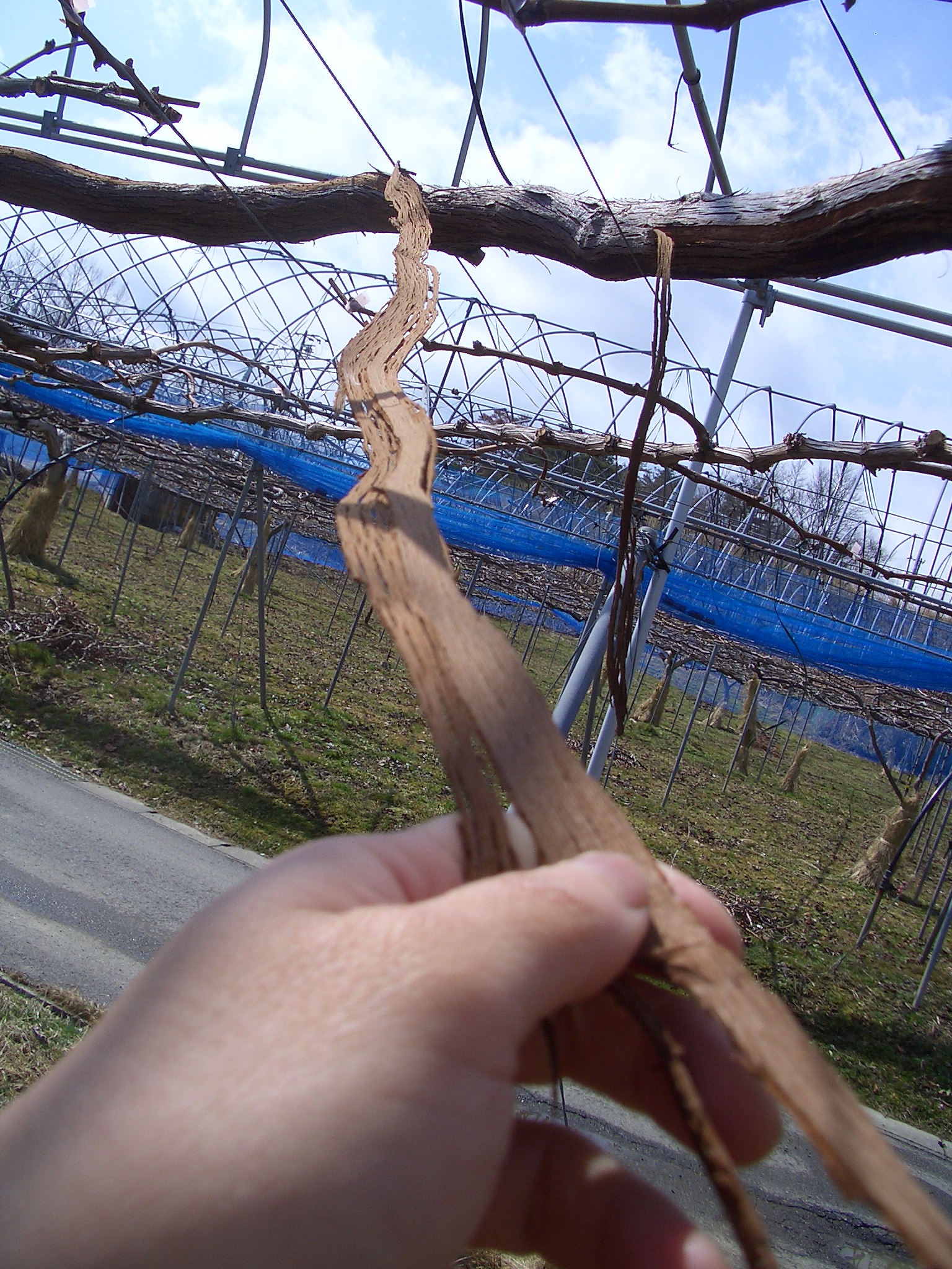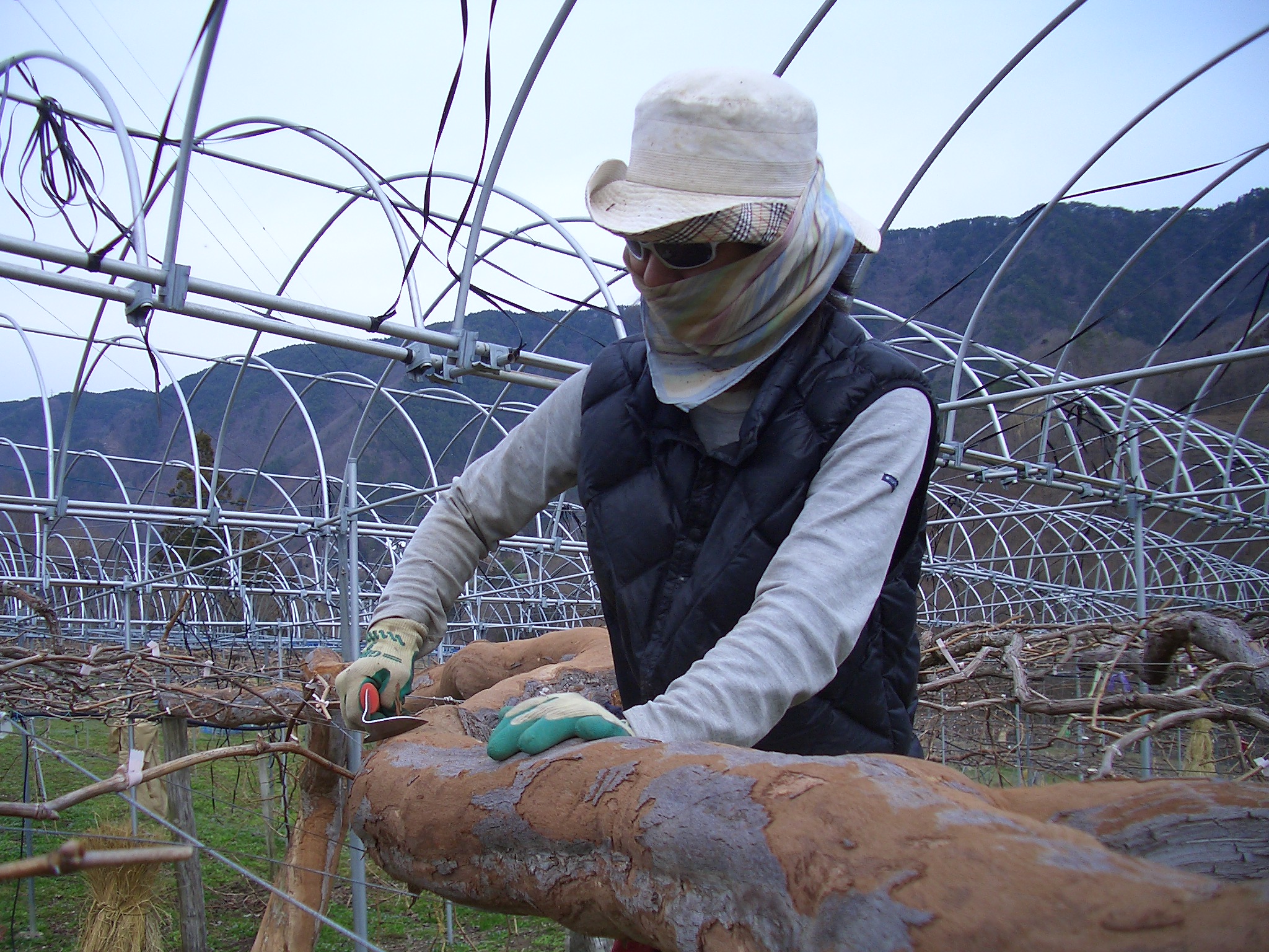 私は、ブドウの木の皮むき作業で、サングラスはしているものの