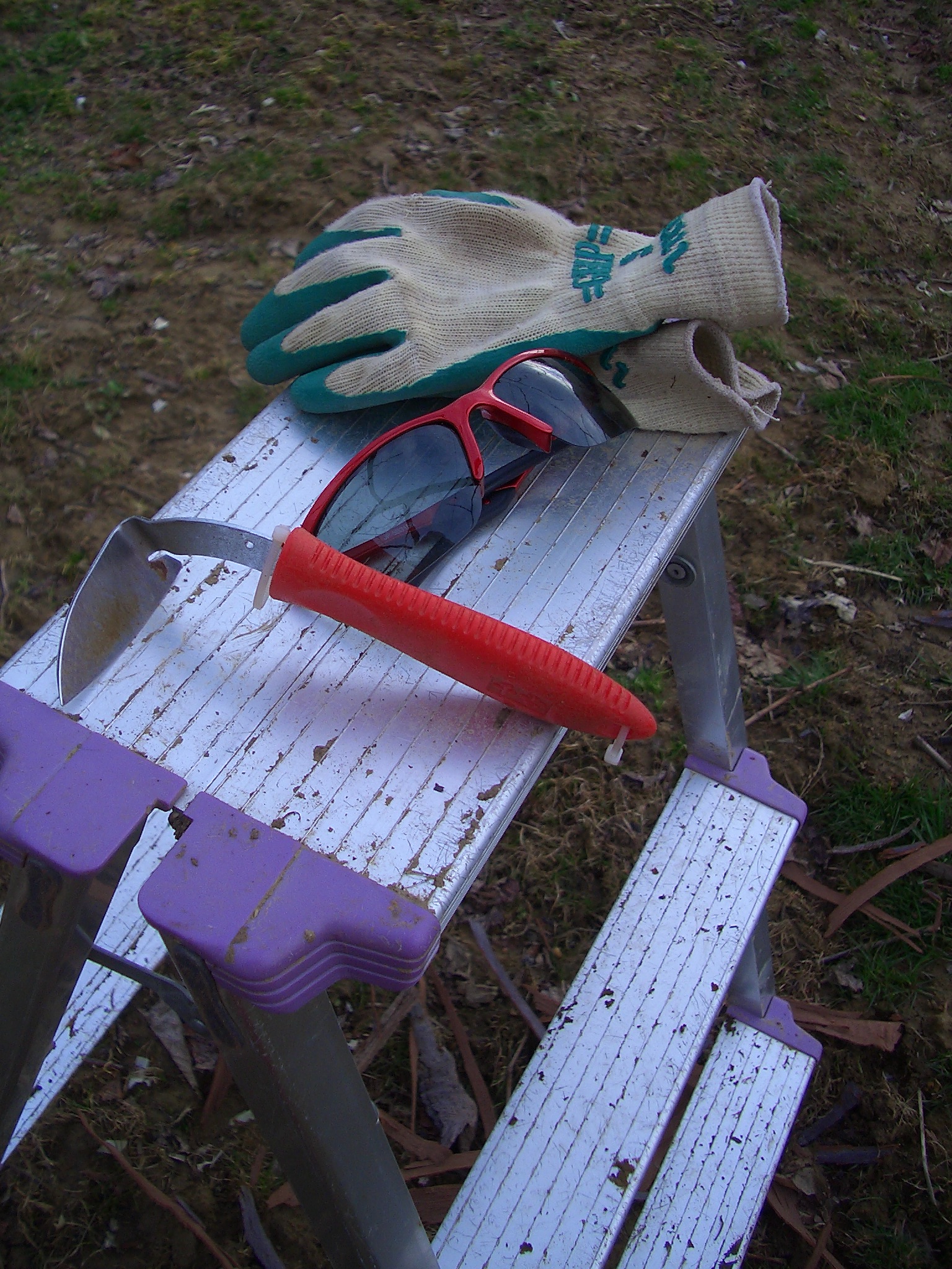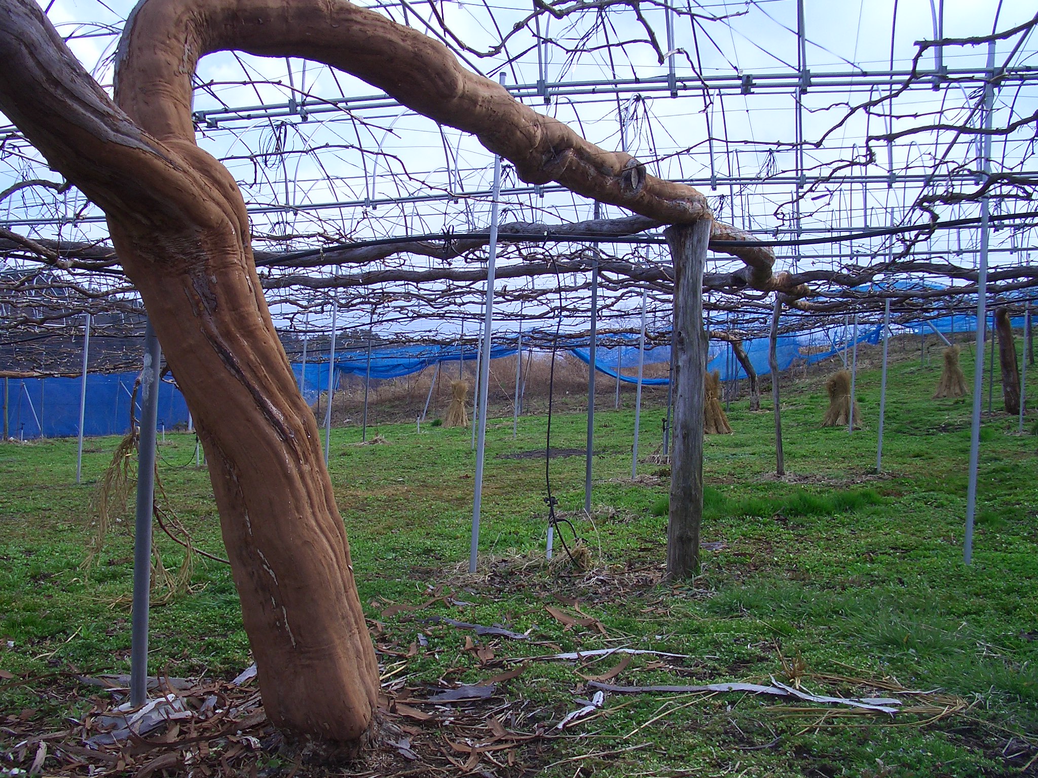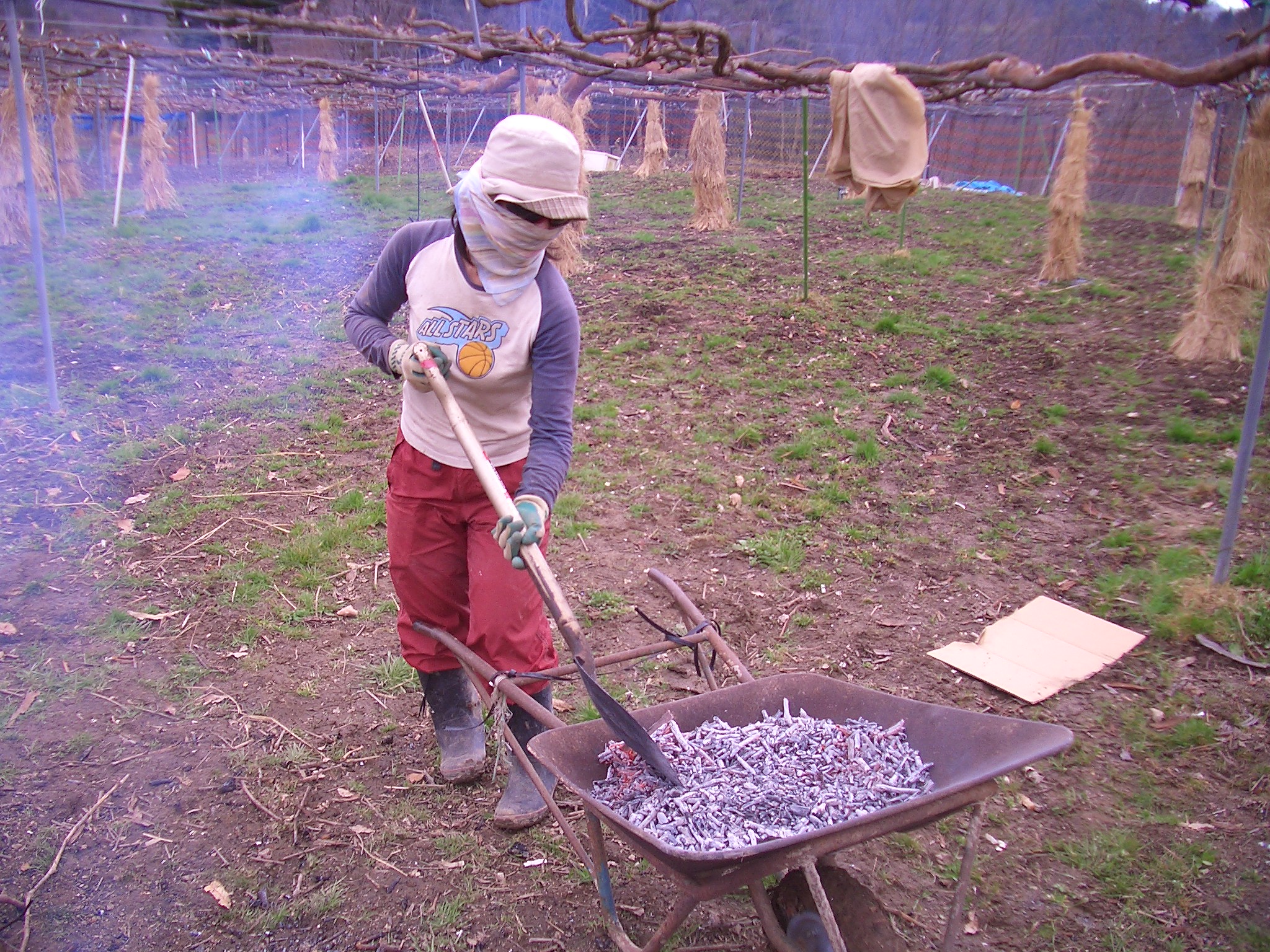 私は、ブドウの木の皮むき作業で、サングラスはしているものの