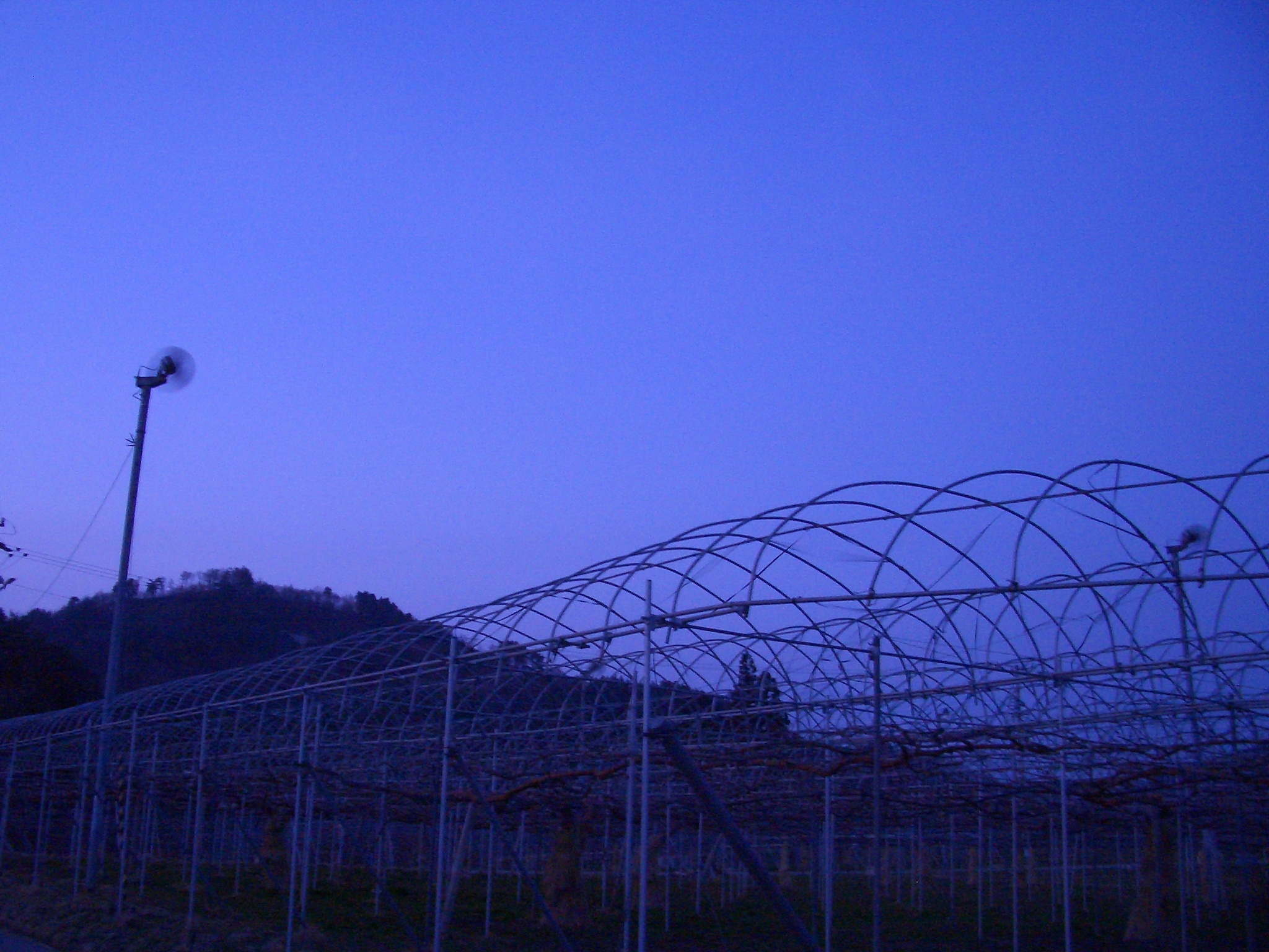 巨峰の役員の方が各畑をまわって、「防霜ファンと散水の調整」を