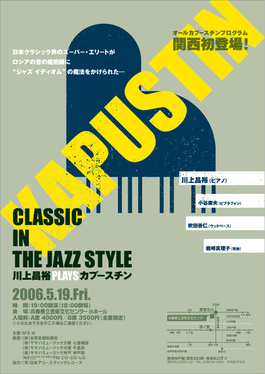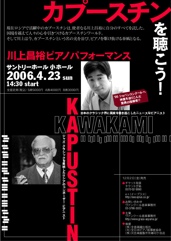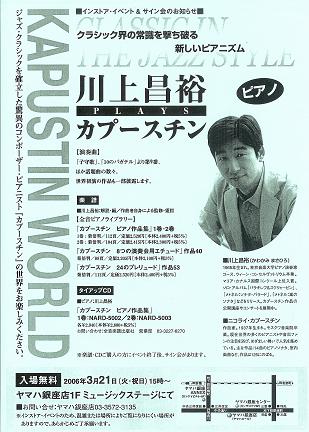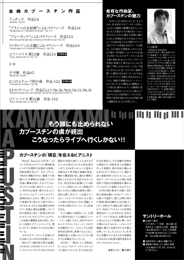 日本でカプースチンといえばこの人、川上昌裕氏。もうご存知の方も多いかと思いますが、彼によるオールカプースチンプログラムのコンサート(ライブ?)が来春行われます。全プログラム中2/3が作品番号100番以降、そしてその内2曲が世界初演という、あらゆる面において川上氏以外には絶対に行えないプログラムになっています。