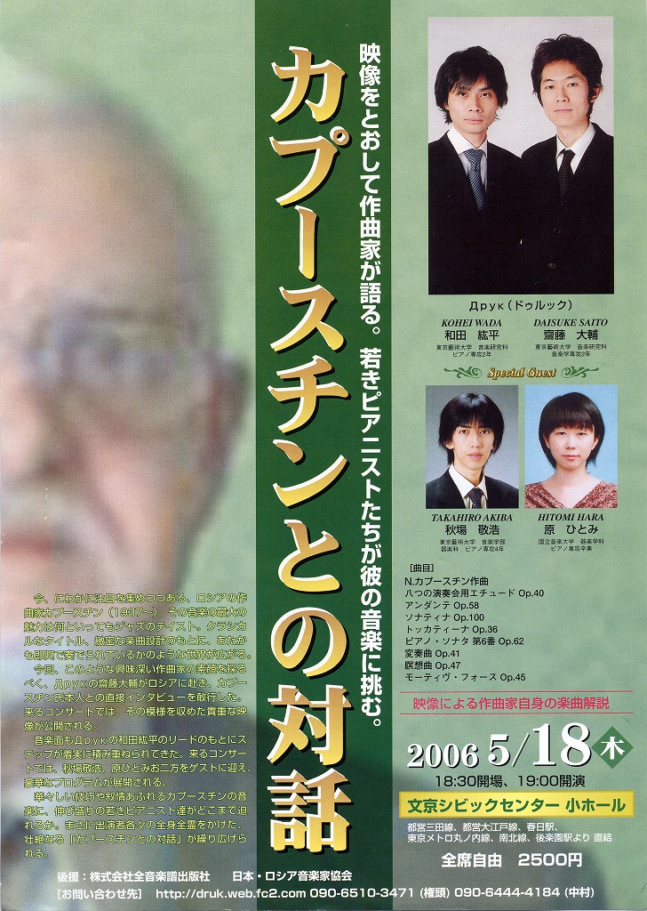 出演者である齋藤大輔さんは、大学での論文にカプースチンを取り上げるなど、カプースチンの音楽に強く魅せられた人物の一人。今年2月になんと単身ロシアへ赴き、カプースチンに直接会いに行ったのですから恐れ入ります。チラシによれば、「映像による作曲家自身の楽曲解説」があるとのこと、これは見逃せません。