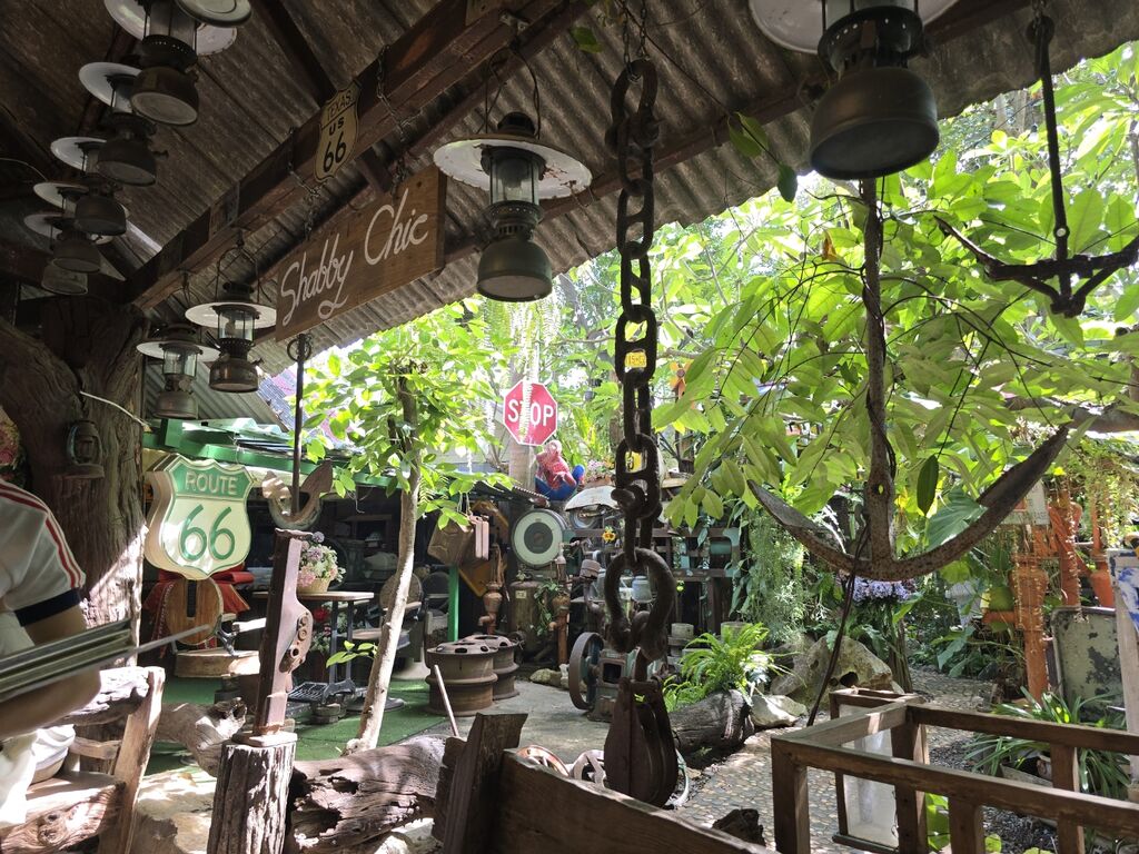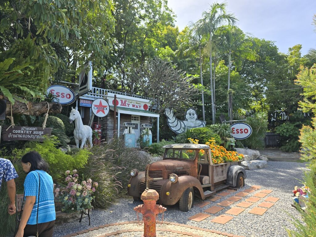 古いガソリンスタンドの給油機に船の舵というわからない組み合わせの一角とか、