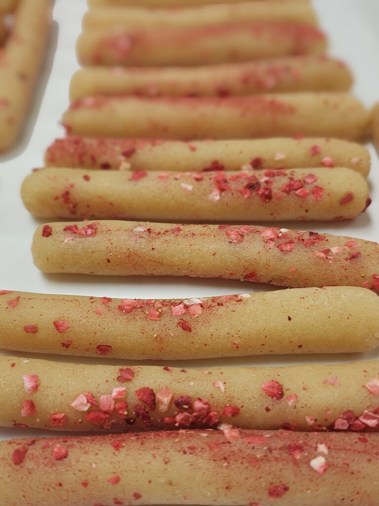 フリーズドライのいちごをまぶしています。