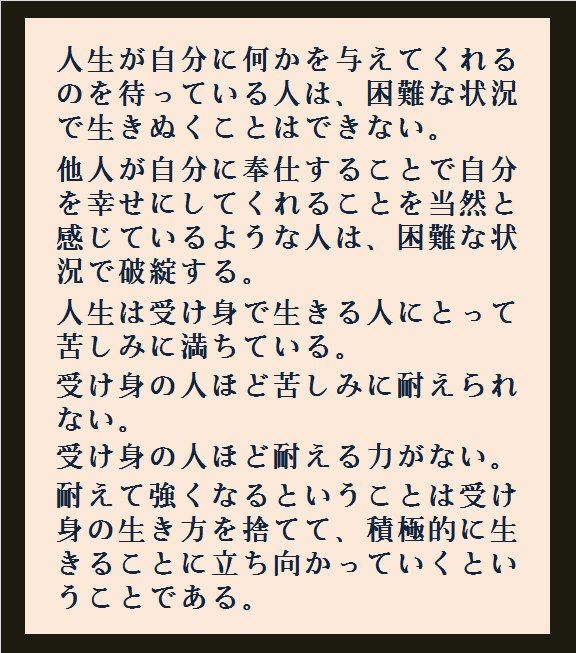 「心配」しないことである。動機はやる気、実行は勇気、実現は根気。自分を高めていく喜びこそ、
