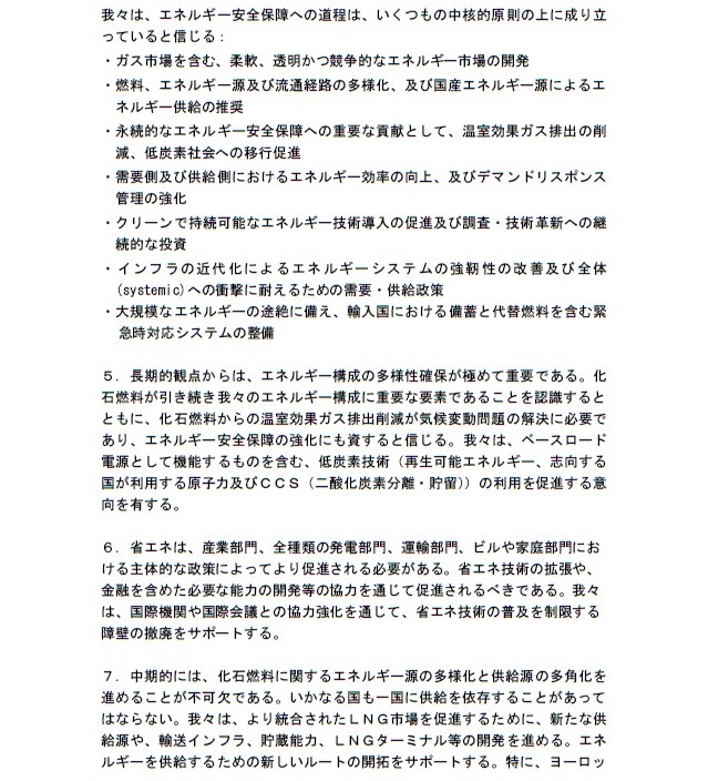 2.大胆なエネルギー安全保障の向上のための改革を推進していくことに合意。また、(1)柔軟、透明、競争的なエネルギー市場の構築、(2)エネルギー源の多様化、供給源の多角化、国産エネルギー源の開発及び省エネルギーの促進などの中核的原則に合意。