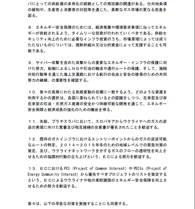 1.エネルギーは、政治的な威圧や安全保障上の脅威として利用されてはならず、エネルギーに係る対立は、対話を通じて解決されるべきことで一致。