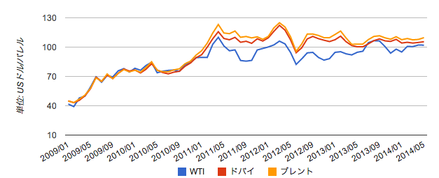 <資料1:原油価格の推移(2009年1月〜2014年5月)>