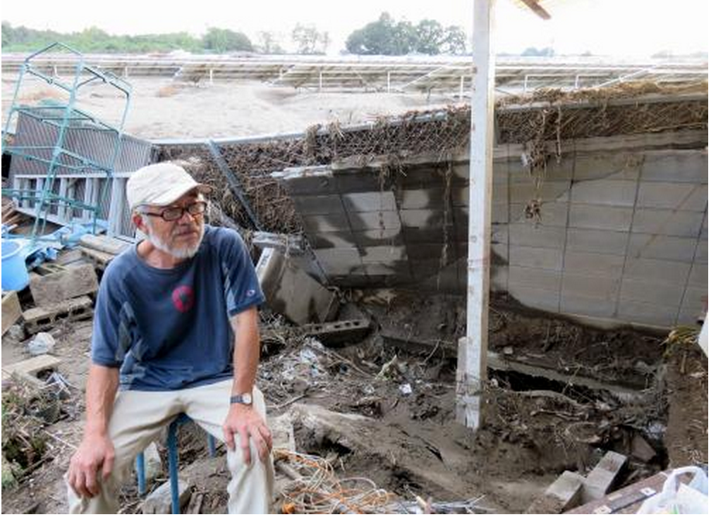 ・メガソーラー設置のため自然堤防が掘削された場所から越水が起きた若宮戸地区の逆井正夫さん。〔写真〕