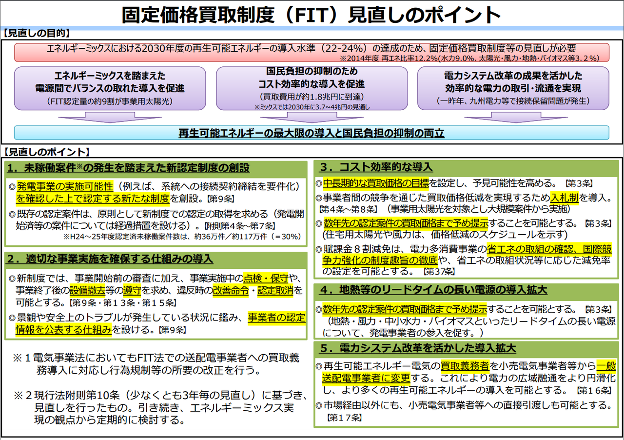 今月9日、再生可能エネルギーの固定価格買取制度(FIT)を見直すための「電気事業者による再生可能エネルギー電気の調達に関する特別措置法(再エネ特措法)等の一部を改正する法律案」が閣議決定され、今国会(第190回通常国会)に提出された。