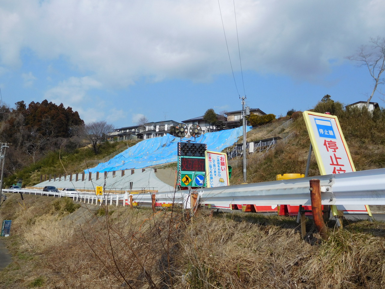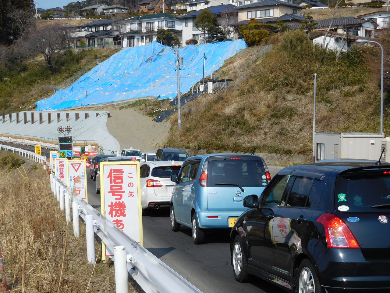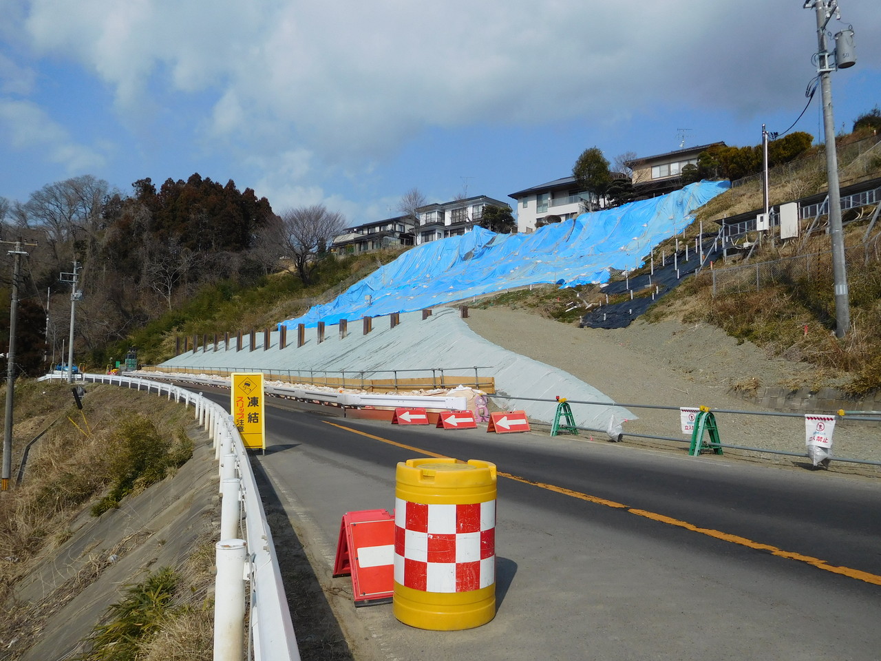 では今現在はどうかというと、私の知人が昨日送ってくれた現場写真は下の4枚。これを見る限り、今もって交互通行であり、道路の完全復旧には至っていないようだ。