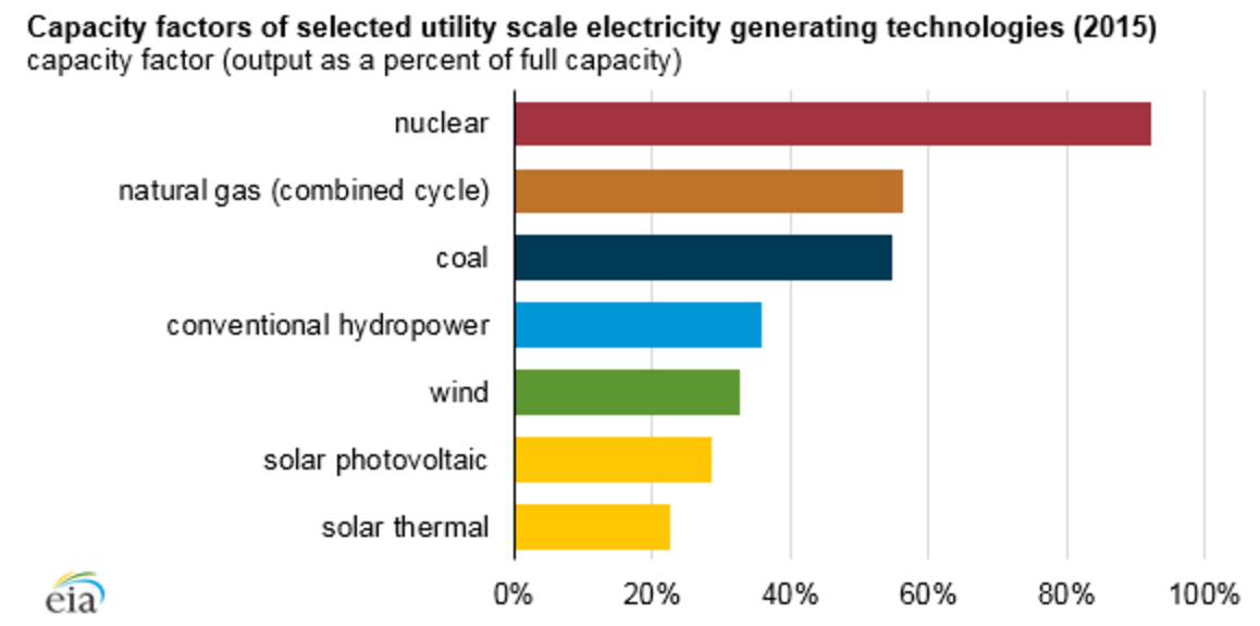 ・・・Nuclear generators, for instance, operated at 92% average capacity factor in 2015. Natural gas combined-cycle units (the most common natural gas generation technology) and coal units operated at average capacity factors of 56% and 55%, respectively. Average capacity factors for wind and solar are lower, at 33% for wind, 29% for solar photovoltaic, and 23% for solar thermal generators.