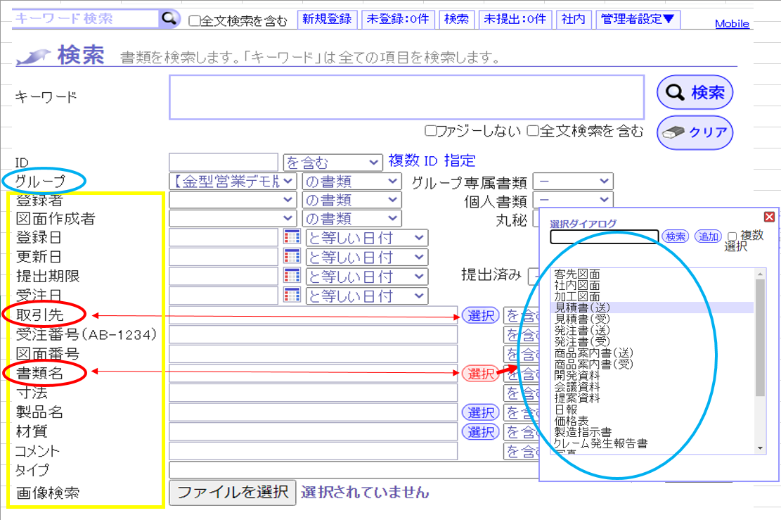 どういう事かといいますと、運用段階で検索に必要なキーワードを「取引先・受注番号・図面番号・書類名」といった項目でカスタマイズしておきます。