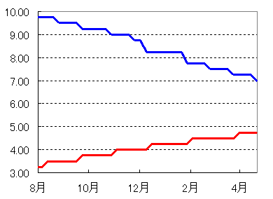 僕が預けているのはずばりソニー銀です(始めは新生でしたが、途中でいきなり為替手数料を値上げされたのが腹ただしく乗り換えました。今や新生は無料の振込みと引き出しの専用口座です(笑))。よく分らないとおもうのは銀行の外貨預金に対する金利に関してなのです。最近のアメリカ短期金利(5%くらいだった?)の上昇でソニ銀もちょっとずつですが金利を上げていて、いま一ヶ月定期が3.7%位になっています。しかし今すべてのUSDを3年定期にすれば4.3%くらいの利息をえられることになっています。素人が考えるに、短期は利息を短期金利に近くして、長期は銀行の考えるシナリオに沿って高くするか低くするか決めるべきと思うのですが、どうやら逆になってるように見えるのです。いずれ短期金利よりは低く設定しているから損はないと銀行は考えているのでしょうが、いったいこれはどう言うことなのでしょう?(NZなんかは利下げが取りざたされていますが短期長期とも高金利です)。もう●●万ドルほどの十分な量のUSDをFXで買っていて十分な利益が出ているので、銀行のを切ってその分までFXに突っ込む気はないのですが、そろそろ銀行の外貨預金は切るべきか悩んでいるのです。こういう場合は銀行預金のポジションを少しずつ落としていくのが得策なのでしょうか?これからも役に立つ記事を期待してます。お体に気をつけて頑張ってくさい。