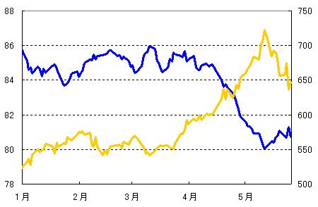 4月中旬からのドル安・円高局面が終焉した後のドル反発局面であるとの認識です。約1ヶ月にわたるドル安・円高の動きがあまりに一方的で値幅も通常統計的に想定できる範囲を大幅に超えて円高になったため、その後の反発局面、すなわち先週からのドル高・円安方向への動きも、それなりの大きさになるであろうと予想します。