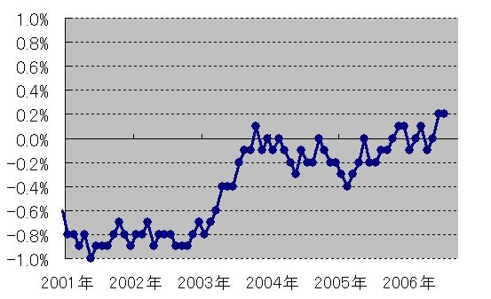 (2006/3/2過去記事で消費者物価上昇率のグラフを掲載しましたが、今回は、基準改定後の直近の数値もつなげたグラフです。)