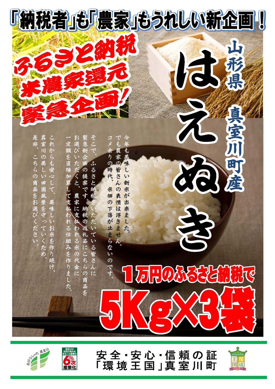 ←山形県真室川町、1万円のふるさと納税で5kg×3袋=15kgも