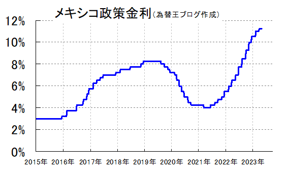 【メキシコ政策金利推移グラフ】メキシコペソ投資、外貨預金と同じレバレッジ1倍でスワップ金利は年率12%高金利!毎日増えておトク!