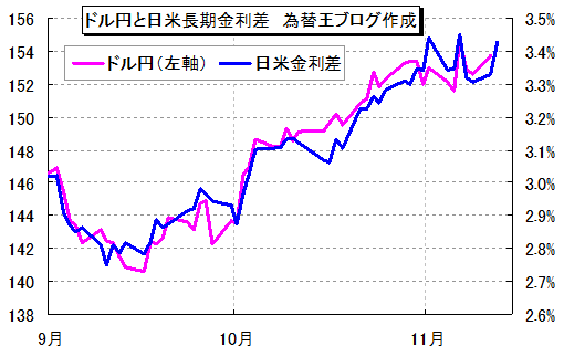 日米金利差とドル円のグラフ。青色(日米長期金利差=国債10年物利回り格差)と桃色(米ドル円の為替レート)、密接に連動していることが分かります。11月に入ってから〜〜〜