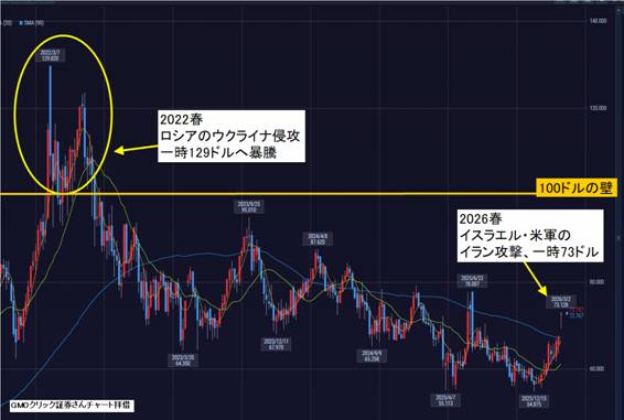 2026年3月2日、週末にイスラエル・アメリカ軍がイラン攻撃したことを受けて原油価格が上昇。中東情勢により、原油価格が上昇すると、国民生活が苦しくなるといわれますが、原油CFDを買えばリスクヘッジになります。原油の小口取引(CFD)は、GMOクリック証券さん、Plus500証券さんで取り扱い!ここではGMOクリック証券さんで原油トレードする具体例をご紹介します。