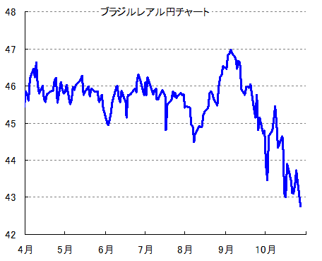 ブラジル大統領の続投(再選)が決まりました。高成長だったブラジル経済をぼろぼろにした張本人ですので、市場のムードは真っ暗。ブラジルの株価指数は一時前週末比6%も急落し、通貨レアルも売られました。