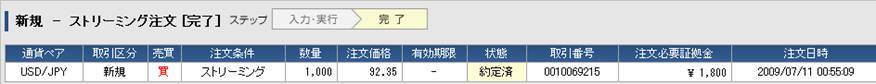 実際にデモ口座で、注文数量「1」を入力して1,000通貨単位を92.35で買ってみました。1秒後には注文が通りました。