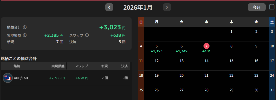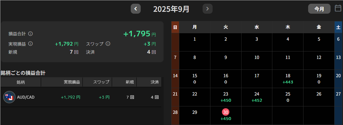 AUD/CADのスワップは現在、1万通貨あたり1日10円(買い+10、売り-10)。AUD/NZDが1日30円(買い+30、売り-30)なので、それよりもスワップ金額を気にせず長期戦略をとりやすいかなと思います。