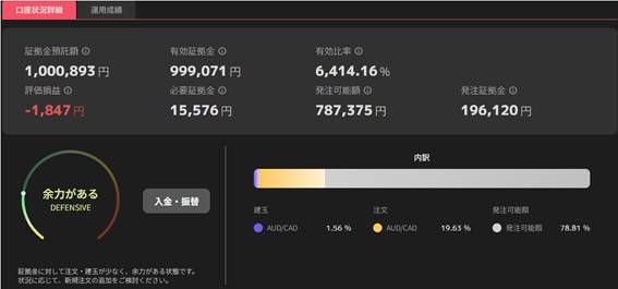 証拠金100万に対して、使用証拠金1万5,576円。余力がありすぎる=安全運転すぎる状態ですが、この超安全運転でしばらく続けます!