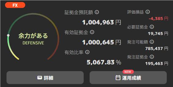 証拠金100万に対して、使用している必要証拠金わずか1万1,745円。余力がありすぎる=安全運転すぎる状態ですが、この超安全運転でしばらく続けます!