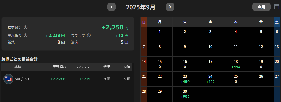 私の考案したAUD/CADのFX自動売買戦略ならば、過去3年間(2022/9/14〜2025/9/13)、推奨証拠金50万円で総合損益+22万円。