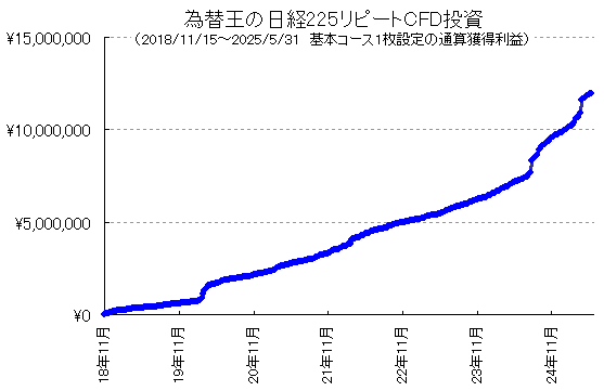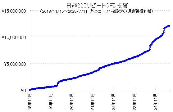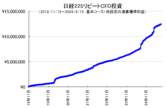 日経225リピートCFD投資、今年も過去最高益ペース!6年8カ月で累積利益+1215万円。10枚設定なら1億2千万