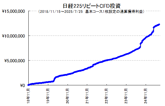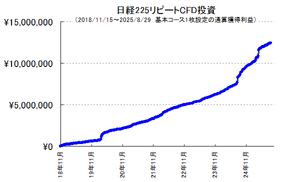日経225リピートCFD投資、今年も過去最高益ペース!6年9カ月で累積利益+1243万円。10枚設定なら1億2千万