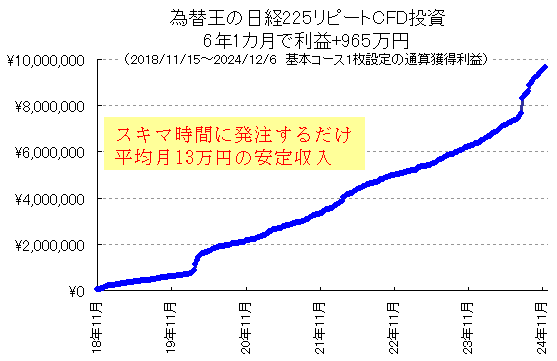 『日経225リピートCFD投資』基本コース1枚あたり、実績公開スタートしてから6年経過(2018/11/15〜2024/12/6)で確定利益総額+965万円。月平均13万円くらい。もし10枚設定なら月平均130万円以上なので6年ちょっとで利益1億円になります。みなさまそれぞれ基本コースをアレンジして1枚あたりの利益をもっと伸ばしておられます。基本コースそのままマネするだけでも上図のような好成績です。