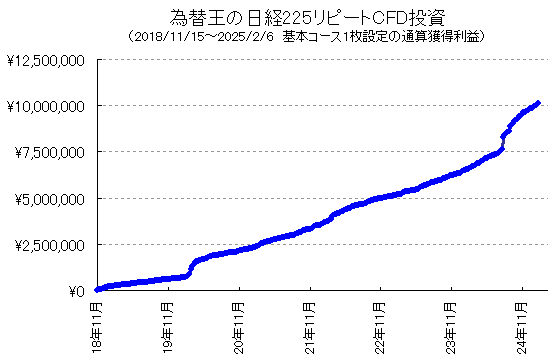 『日経225リピートCFD投資の始め方レポート』基本コース1枚あたり、実績公開スタートしてから6年3カ月(2018/11/15〜2025/2/6)で確定利益総額+1014万円。月平均13万円くらい。もし10枚設定なら月平均130万円以上。多くの読者様が、基本コースを自分好みにアレンジして1枚あたりの利益をもっと伸ばしておられます。基本コースそのままマネするだけでも上図のような好成績です。