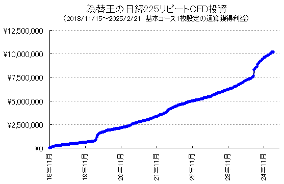 『日経225リピートCFD投資の始め方レポート』基本コース1枚あたり、実績公開スタートしてから6年3カ月(2018/11/15〜2025/2/21)で確定利益総額+1019万円。月平均13万円くらい。もし10枚設定なら月平均130万円以上。多くの読者様が、基本コースを自分好みにアレンジして1枚あたりの利益をもっと伸ばしておられます。基本コースそのままマネするだけでも上図のような好成績です。