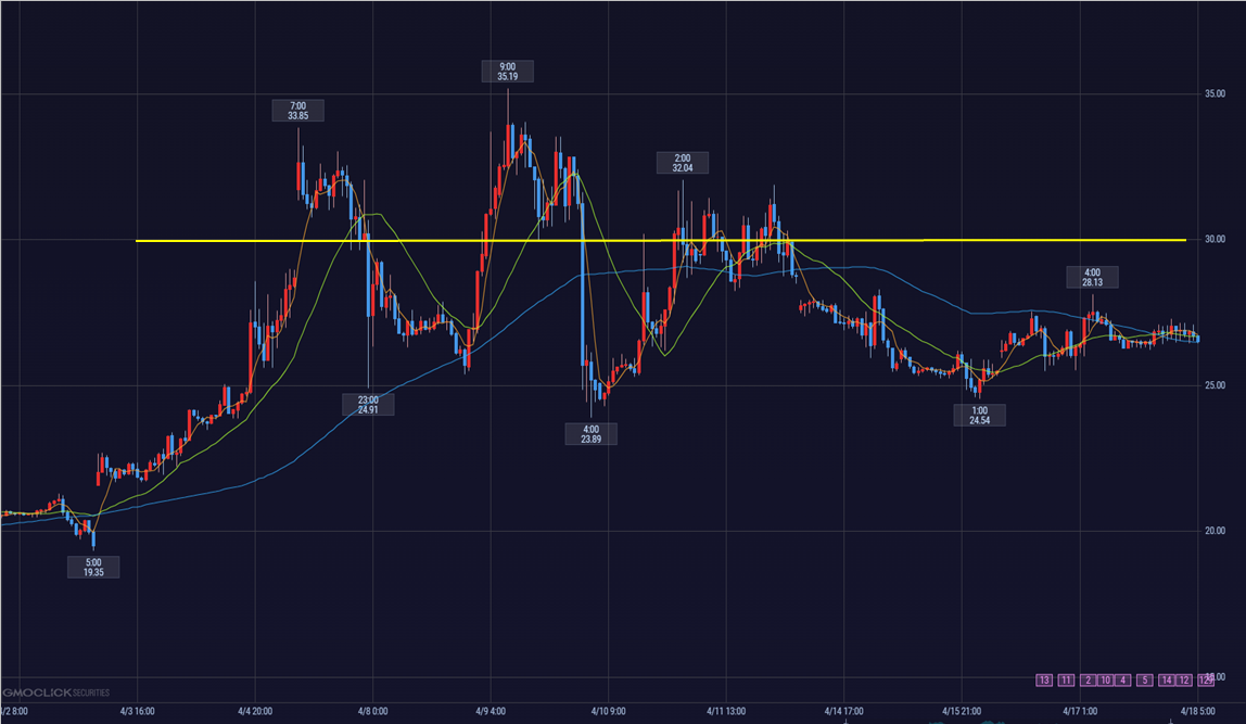 恐怖指数(ボラティリティインデックス=VIX)。画像は4月GMOクリック証券さん米国VIチャート。「黄色のライン30から売り上がって、30未満に戻ったら全決済するトレード法」で、面白いように何度も大儲け!のはずでした。読者の皆様と売りトレード狙っていましたが残念ながら売り規制。。しかし私たちの戦略アイデアは完璧でしたので、ぜひ皆様、自信を持ってください!
