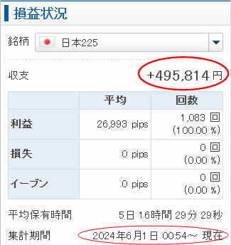 (ツタン君)投資がヘタな僕でも稼げるのか?『日経225リピートCFD投資の始め方レポート』のGMO外貨CFD口座で2024年6月に運用スタート。もうすぐ1年、収支+49万5814円!当初100万円で始めて年間50万円くらい稼げる!夢みたい!