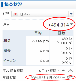 (ツタン君)投資がヘタな僕でも稼げるのか?『日経225リピートCFD投資の始め方レポート』のGMO外貨CFD口座で2024年6月に運用スタート。11カ月半が経過して収支+49万4314円!当初100万円で始めて年間50万円くらい稼げる!夢みたい!