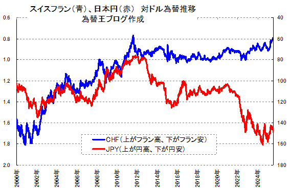 (※目盛りは、上方向がドル安、フラン高、円高。下方向がドル高、フラン安、円安)