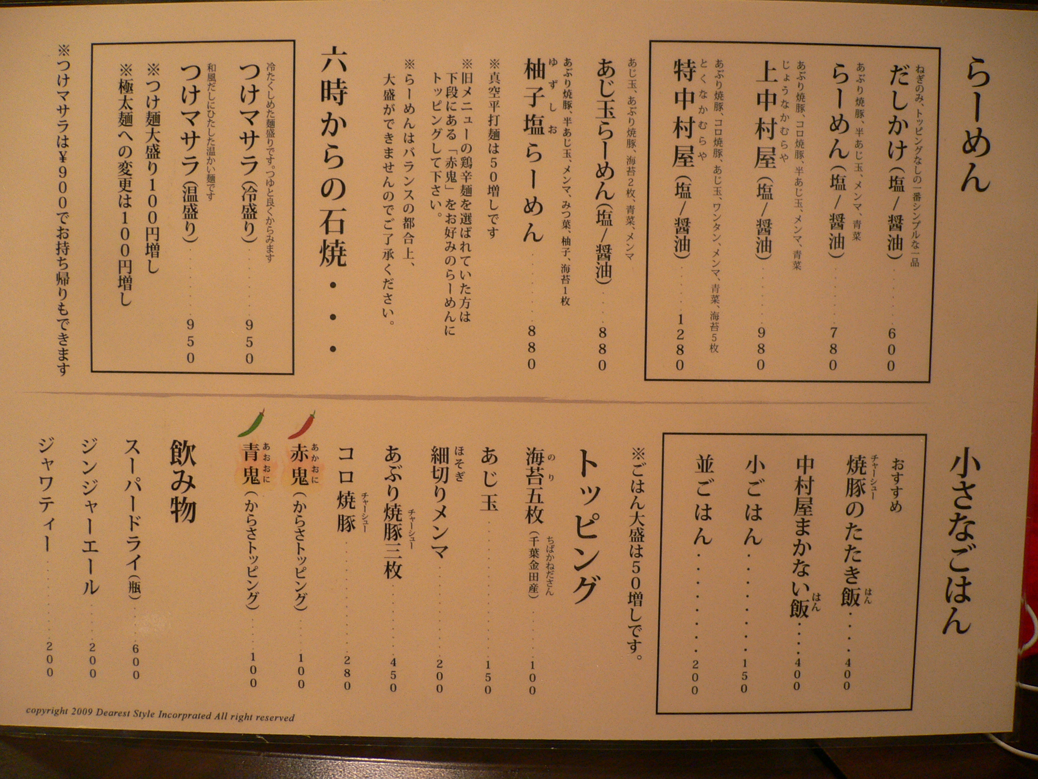 まずざっくり言うと、かけとご飯物のセットがなくなり、赤鬼・青鬼が増えた(同時に鶏辛麺が廃止)感じ。