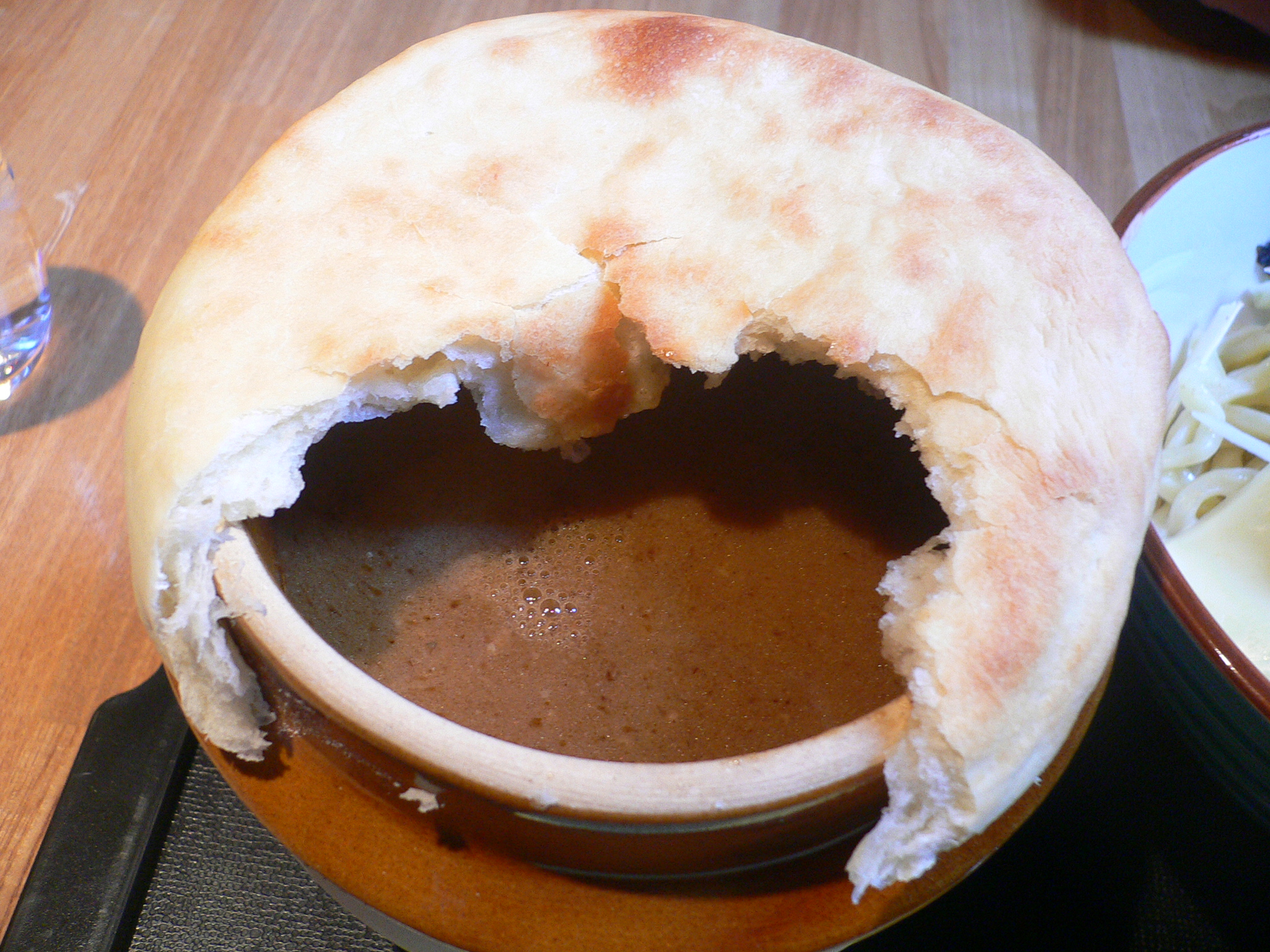 パイ(実際にはパンに近い感じです)を崩すと、その下には濃厚な魚介豚骨スープが潜んでおります。(見えやすいよう、手前を崩しています)