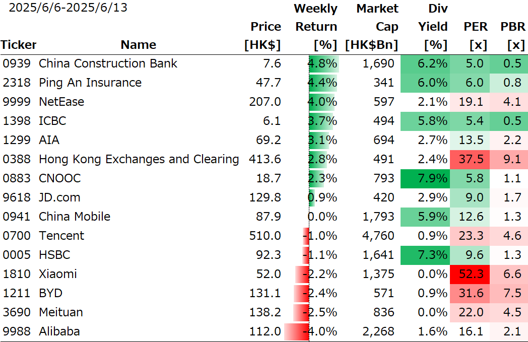 香港・中国個別銘柄の週間パフォーマンス(2025/06/06-2025/06/13)