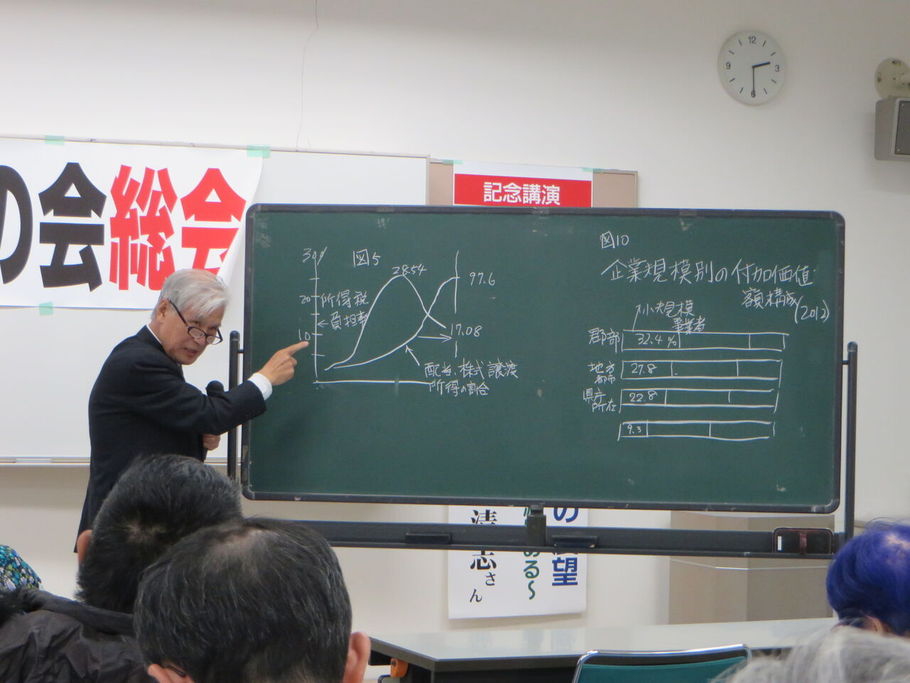 今日の総会では、消費税をなくす全国の会常任世話人の渡邊清志先生から「消費税減税と廃止への展望・不公平税制を正せば財源はある」との演目で講演がありました。