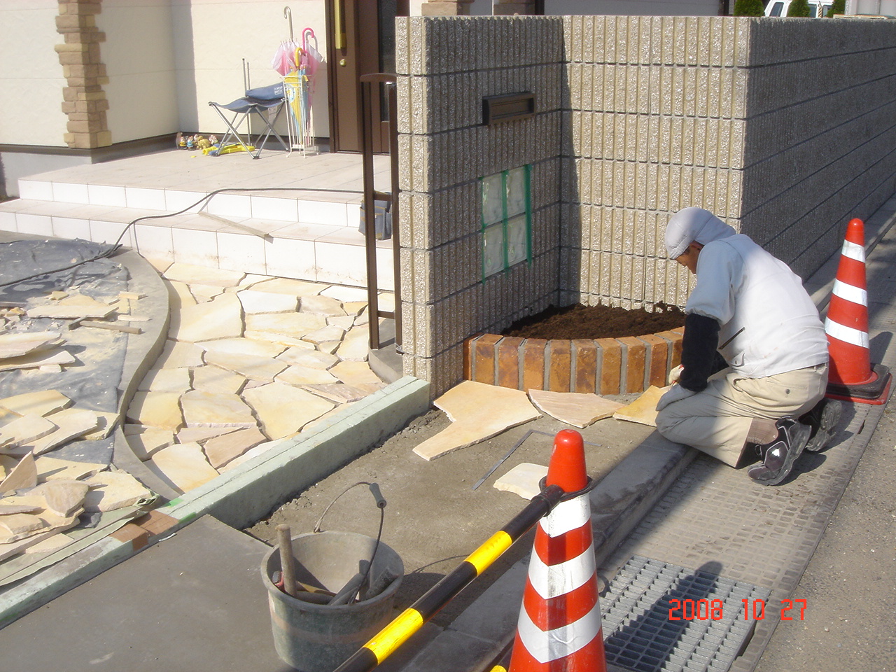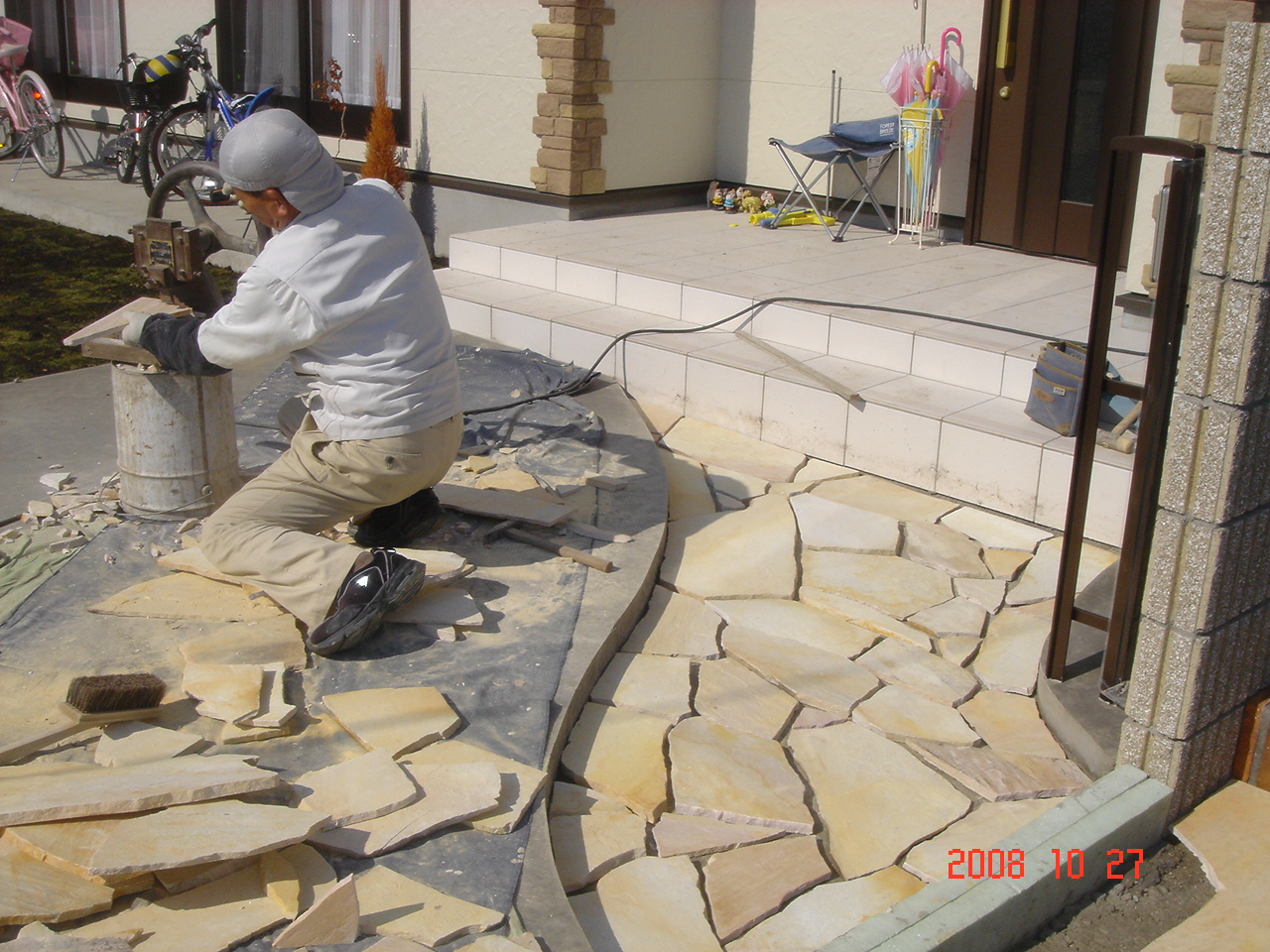玄関前アプローチの石張り工事の様子です。目地をそろえるために加工をしています。