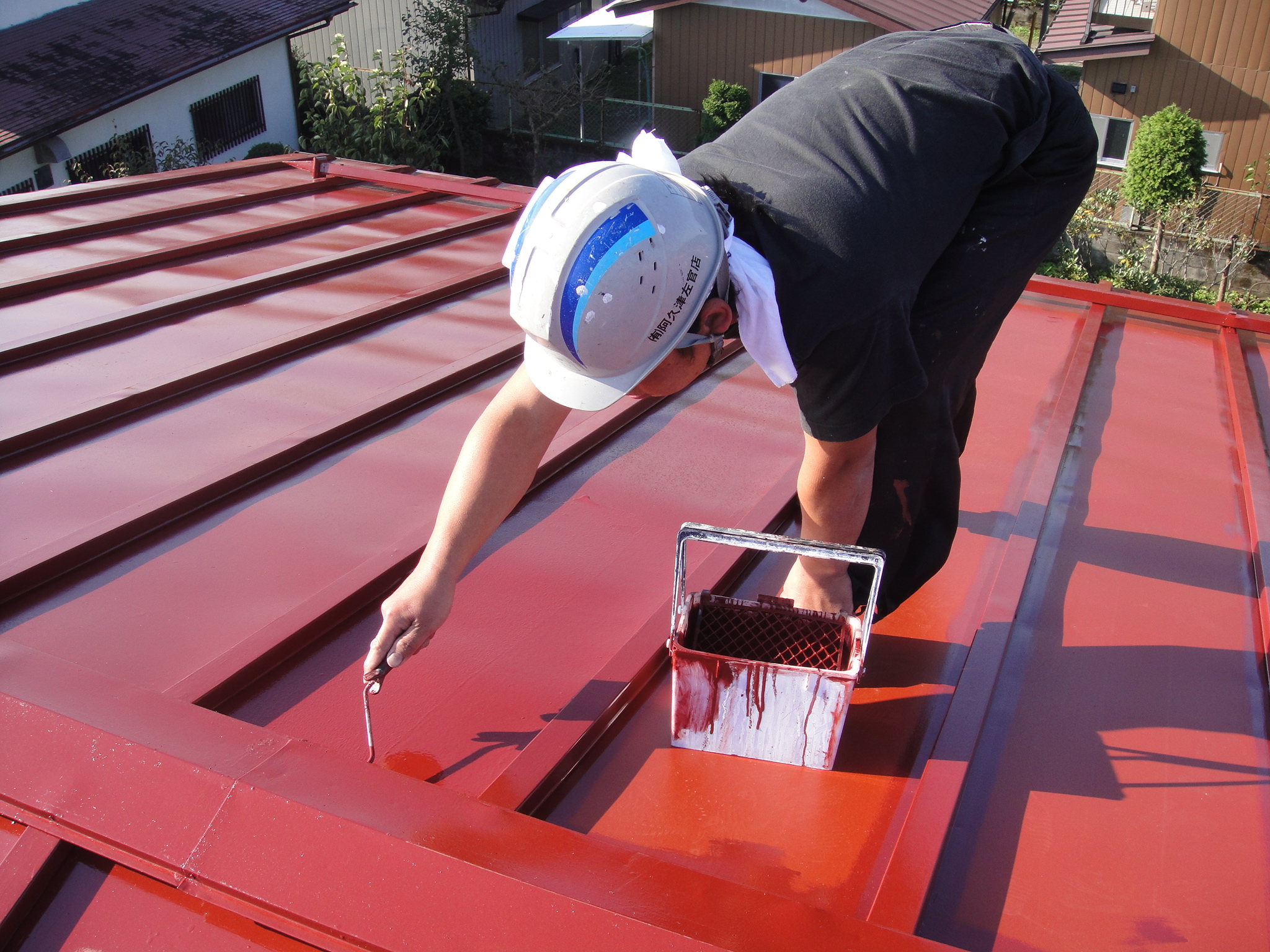 建物のメンテナンスが私たちの仕事です。写真は、屋根のペンキ塗り替えの様子です。