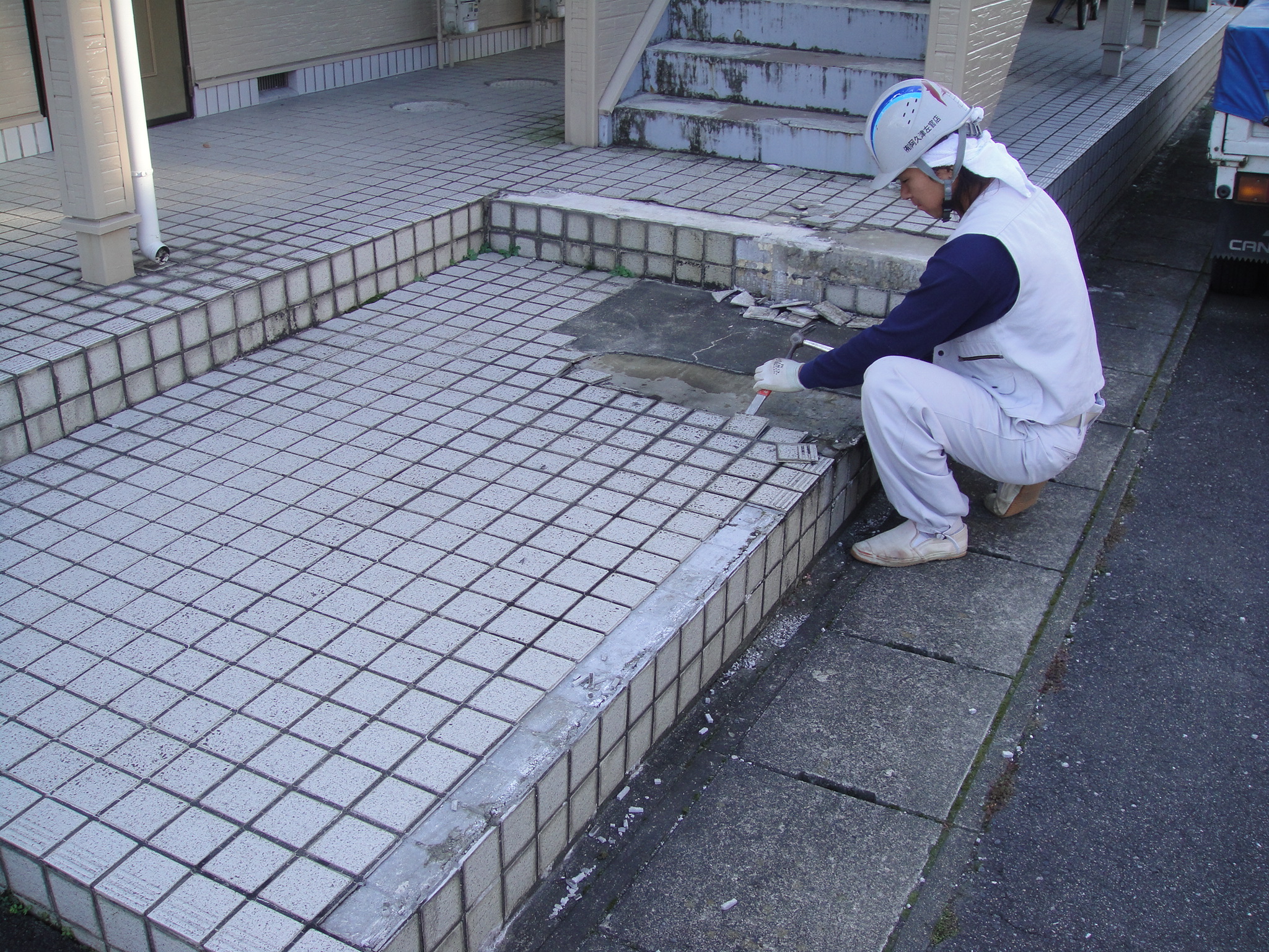 浮いている部分を剥がして新しいタイルに張り替えをします。