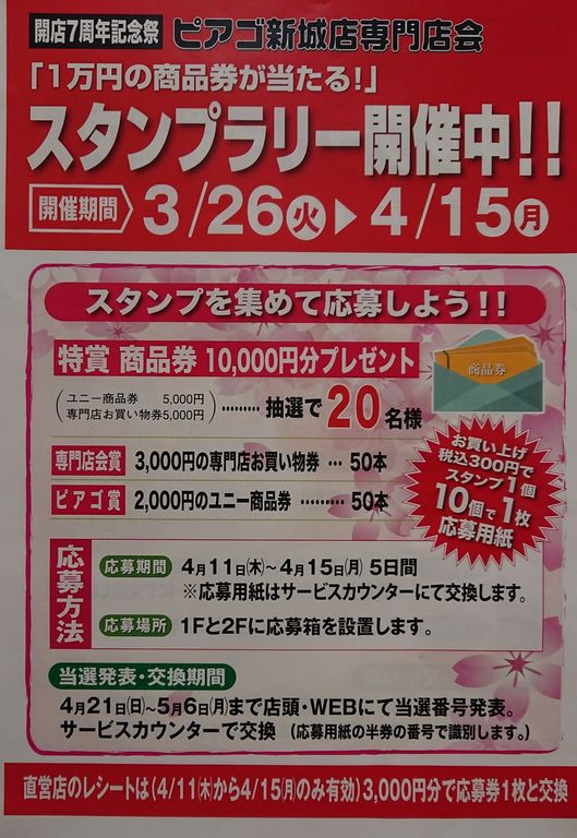 さて、今ピアゴでは、専門店会のスタンプラリー。今度は開店7周年で、お買い物3千円で一口応募すれば、商品券が当たります。スタ脳は300円で一つ。どしどし応募ください。